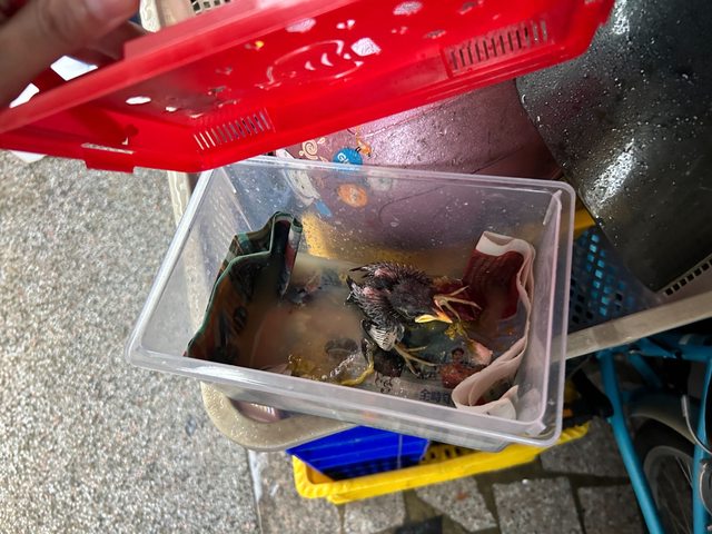 「調查員在訪查案件時,飼主救援了一隻因修剪樹木而落巢的外來種八哥雛鳥,鳥巢已經不