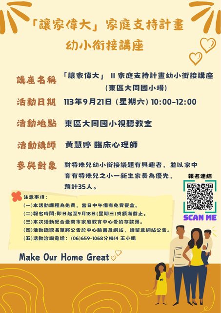 臺南市家庭教育中心於本(113)年9月21日(星期六)上午10時至12時,辦理「讓家偉大家庭