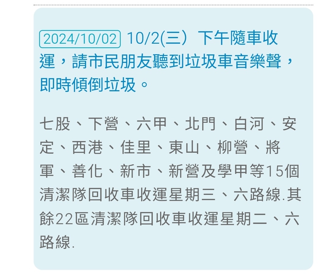 → yun05: 那這樣原定晚上的收運,也會有提前4小時嗎 10/02 13:06