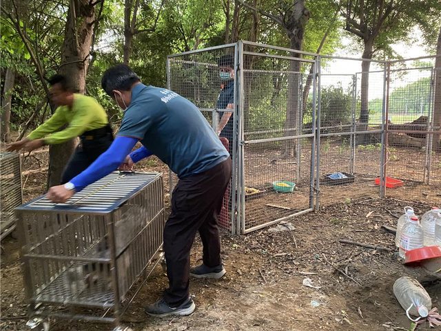 台南市動保處在二王公墓以大型誘捕籠捕捉流浪犬。(台南市動保處提供/寶智華台南傳