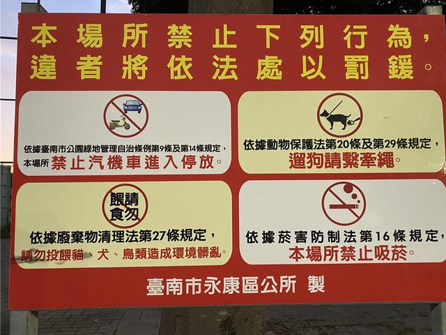 永康區公所在忠孝運動公園附近設立告示牌。(台南市動保處提供/寶智華台南傳真)