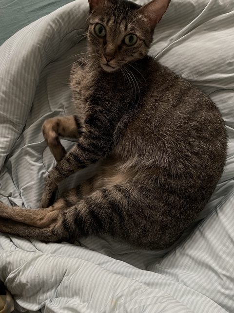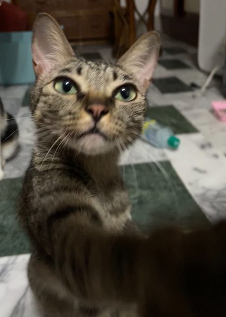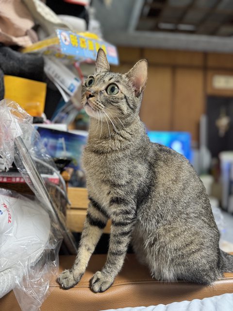 特徵:虎斑(深棕色)、眼睛黃綠色底黑色瞳孔、成貓但瘦小、聲音細