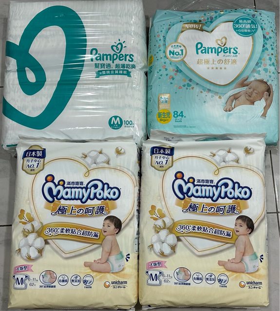 交易物品:未拆封尿布4包合售(滿意寶寶極上呵護M號62片*2、幫寶適超薄乾爽M號100片