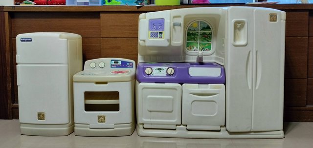 二手廚房3件組,有正常使用痕跡。有2個門,關起來的時候,無法密合,但是不影響玩的樂