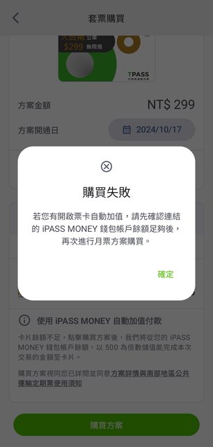 票卡餘額不足且未綁定iPM自動加值(跟官網一樣可以指定啟用日期)