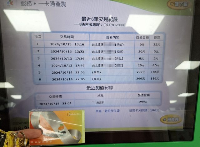默默地推出感應查詢功能(而且交易別標示比悠遊卡清楚,但小額商家不確定,因為MeN Go