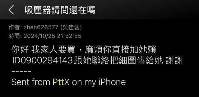 : 下午發了交易文,後來帳號為「姓氏/名(英文)」+「626577」的版友表達其家人想購買