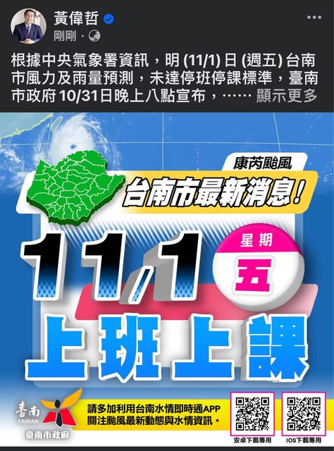 推 a7962904: 明天上班合理 但說今天台南沒風沒雨是在反串嗎 10/31 23:28
