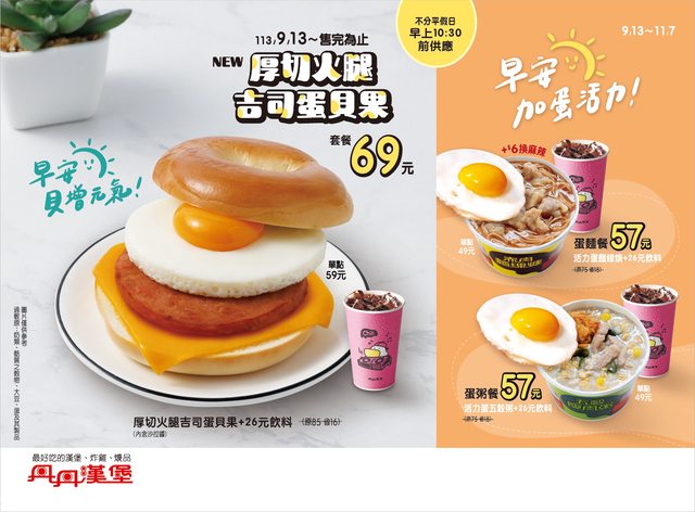 丹丹漢堡厚切火腿吉司蛋貝果餐(活動時間2024/9/13起到售完為止,另外+7元升級大杯