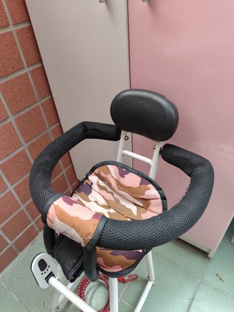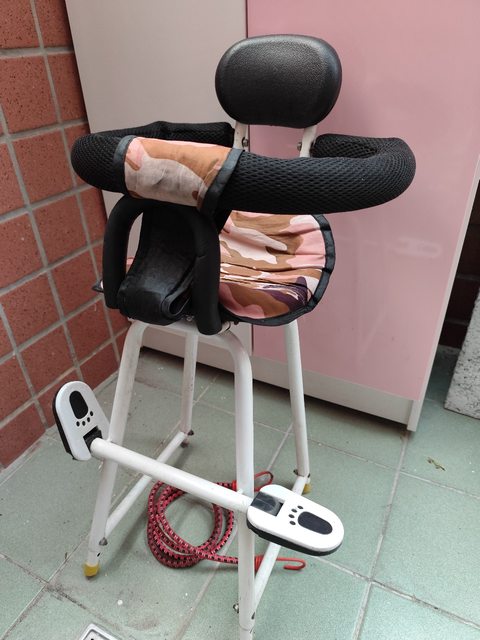 座椅放在機車前腳踏板,用彈力繩繞過踏板底部將其固定拉緊,座椅附有防撞扶手,物品