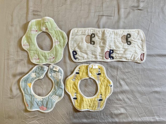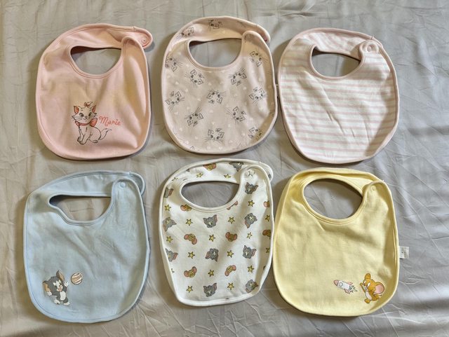 最左邊那兩件有吃副食品 沾到南瓜的黃漬洗不掉, 其他的無明顯髒污。 另贈無品牌圍兜3件 和推車扶手防咬巾1件