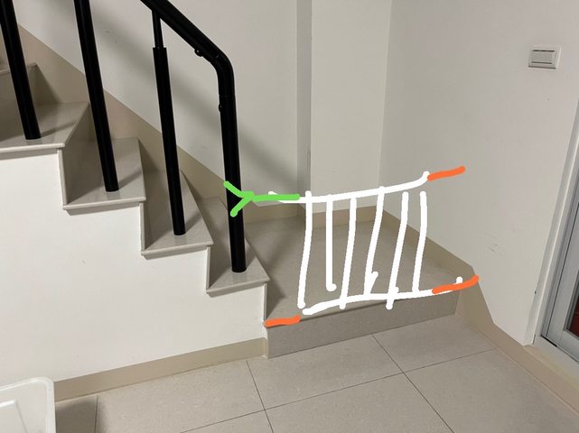 配件詳細如上方圖 有一個螺栓是Y型夾(卡在樓梯的柱子) 若只需要固定於牆面可以上蝦皮買螺栓 (搜尋門欄 零件) 原本安裝示意圖如下(拆下前忘記拍照)