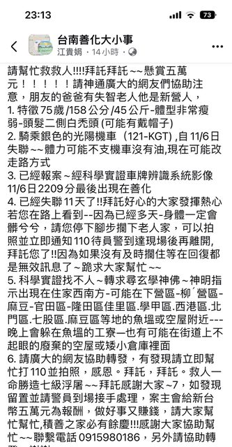不好意思打擾各位,我在善化社團看見有人尋找這位老先生,失智且從11/6起失聯,最後