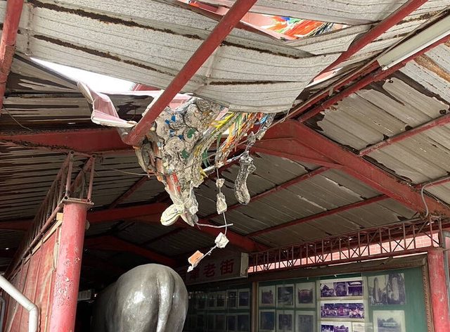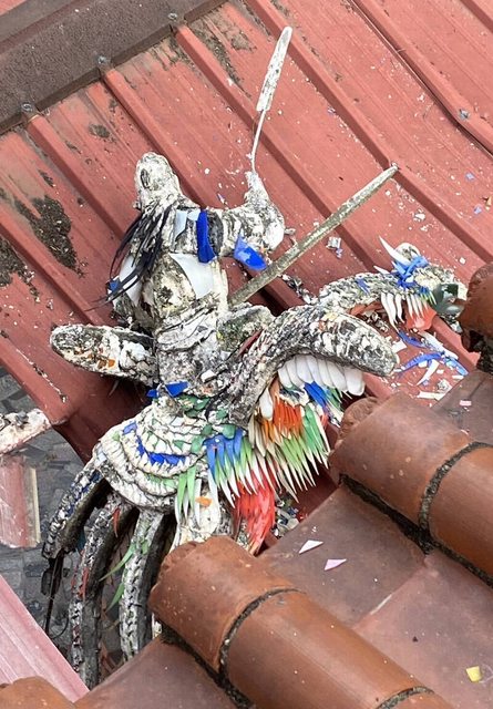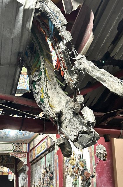 屋簷上方裝飾用的3座大型剪黏雕塑被震落摔毀;昨晚又有1座被震落,砰的巨響,硬生生