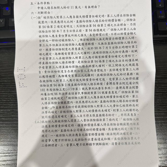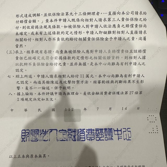 2. 評議中心無法評議的理由根本不是你說的那樣,懶得打了照片你自己看,大意是說因為賠償標的和金額尚未被決定所以無法做出評議。不是我跟對方保險無金融消費關係。
