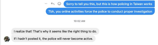 我(文字):Sorry to tell you this, but this is how policing in Taiwan works.