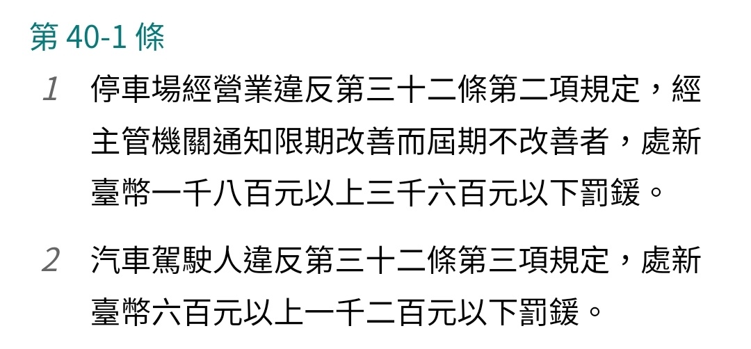 → TobyW : #32-2是說停車業者應通知主管機關,如限期改善仍不 10/03 21:33