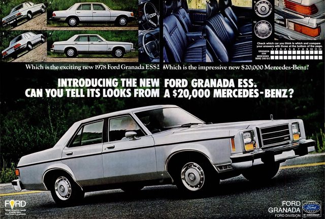 這個廣告直接拿Ford Granada ESS,叫板當時的豪車代表-Mercedes-Benz W116 S-Class