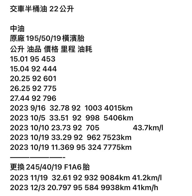 我自己有把原廠的195/50/19橫濱輪胎換掉,換成245/40/19的固特異F1A6輪胎