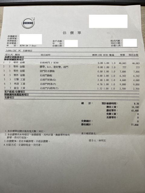 分享一下XC90之前自撞到柱子更換右前門的估價單