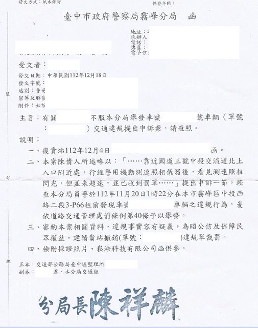 12/22---收到交通隊的函覆,向監理站撤消此罰單。