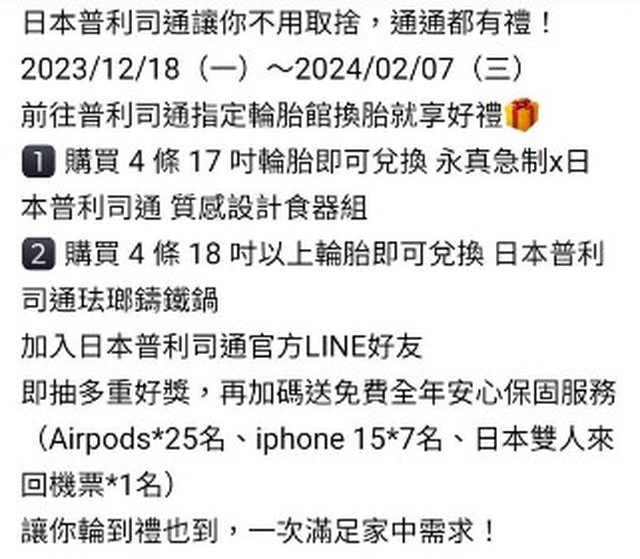 分聽說最大獎是日本雙人機票,老闆會幫忙加普利司通官方賴然後教我怎麼加入 B-care