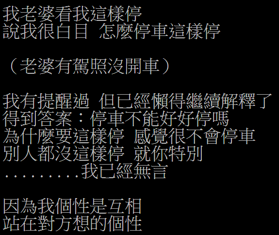 → browner : 我要是你隔壁的拜託你不用幫我著想斜停 這樣很好12/28 16:55