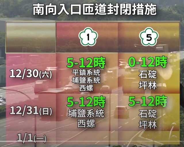 (一)112年12月30日,5至12時,封閉國1平鎮系統、埔鹽系統、西螺南向入口;0至12時,