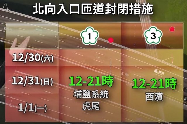 (三)112年12月31日至113年1月1日,每日12至21時,封閉國1埔鹽系統、虎尾及國3西濱北