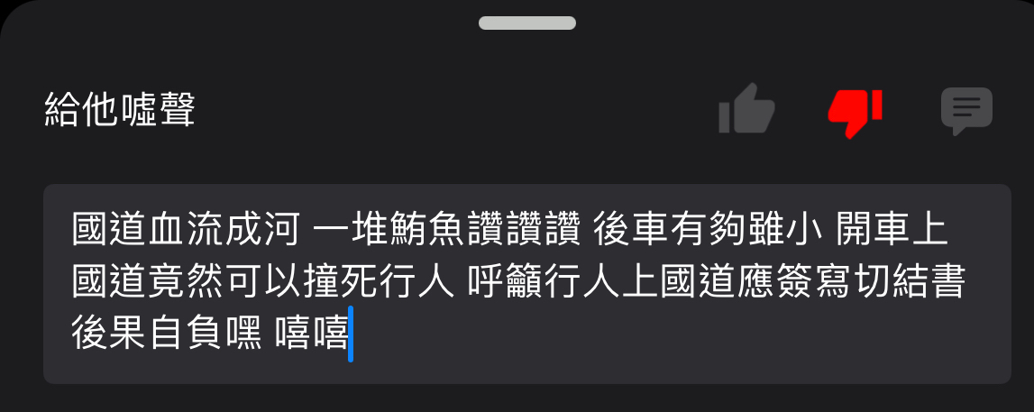 → godchildtw : 下拿主動發光式三角警示牌到後面幾十公尺放,然後 01/05 18:56