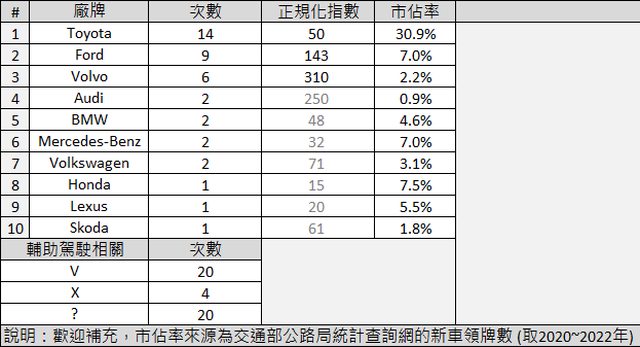表格更新!根據公路局網站近三年的新車領牌數據,再做正規化處理
