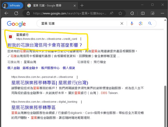 在 Google 上面搜尋"星展 花旗",可以得到 星展的官方網站資訊: