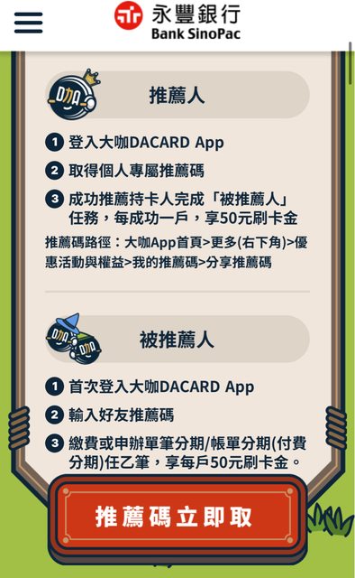 被推薦人:活動期間內以永豐網銀會員身分首次登入大咖DACARD App,輸入推薦碼並成功