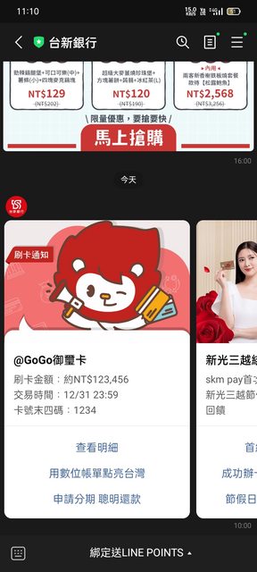→ lyhorcish : 早上蝦皮下單也是收到一樣訊息,看到卡號123411/10 11:38