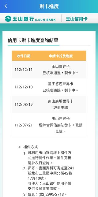 玉山早上9:17來電告知原有的星宇鈦金會先停卡,再審核星宇世界卡,兩小時後簡訊通知核