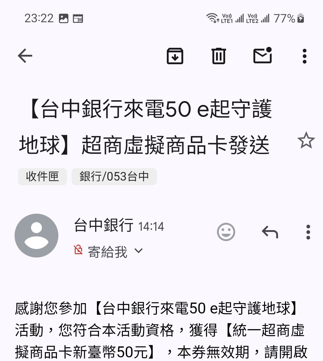 標題[閒聊] 台中銀Bingo70幸福加值 $500 回饋已入帳