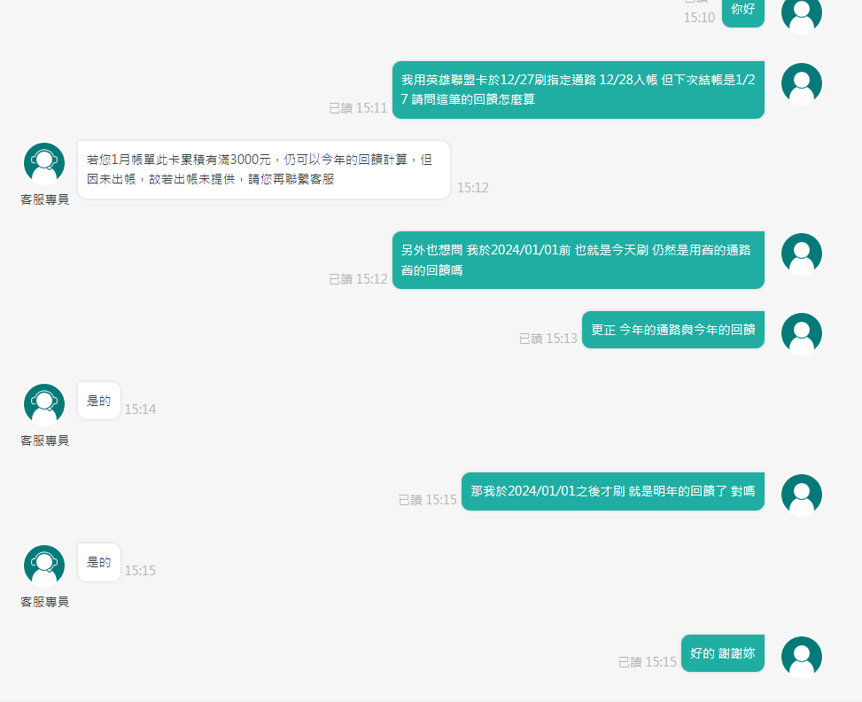 → azxc8756 : 怎麼客服講的不一樣... 所以1/1前刷完3000一樣有回 12/29 16:36