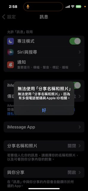 目前好像只能把其他門號停用IMESSAGE留下一個才能正常開啟