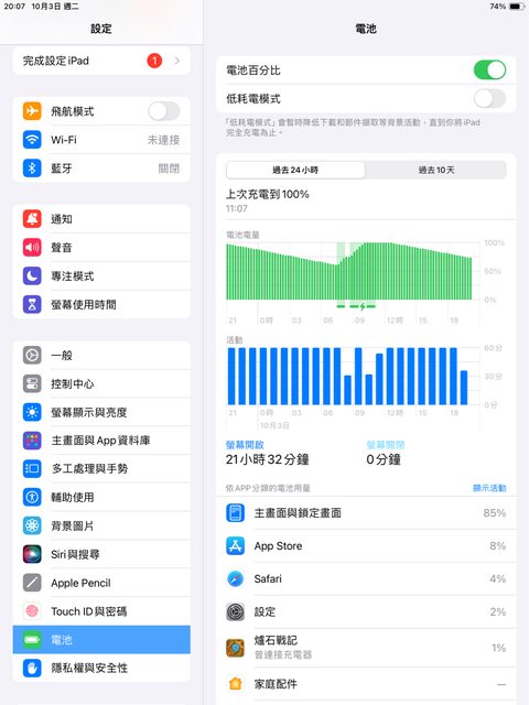 我的ipad前幾天使用都沒問題,有時候24小時都沒使用電量也掉沒3%。