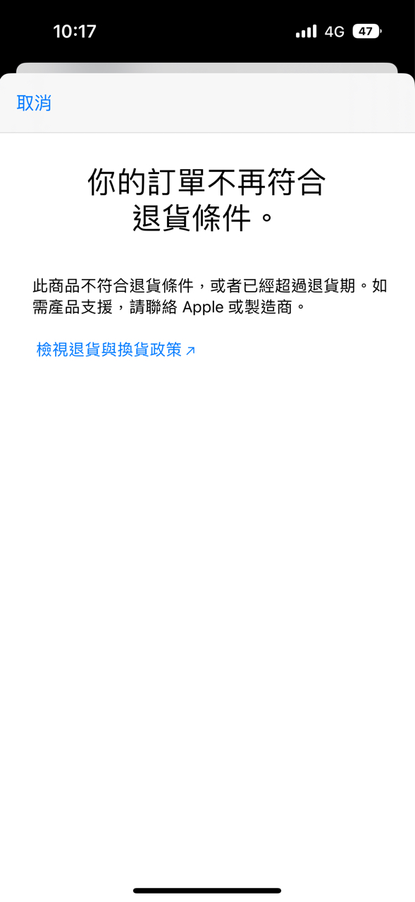 → PeterHu0827 : 自己沒看清楚那也沒辦法 蘋果看要不要破例幫你吧 10/08 16:17
