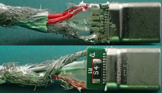 ▼將其接頭分解,CC/D+/D-線正常連接(A5/A6/A7),還有2條V+線路,同時發現在兩端接
