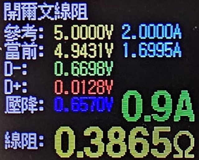 電傳輸線,進行線阻測試,其線路等效內阻為386mΩ,超過原廠線2倍多