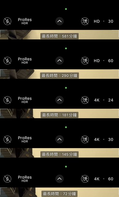 ▼開啟ProRes HDR編碼,連接容量1TB的外部儲存裝置時,HD(1080p) 30fps最長可錄製