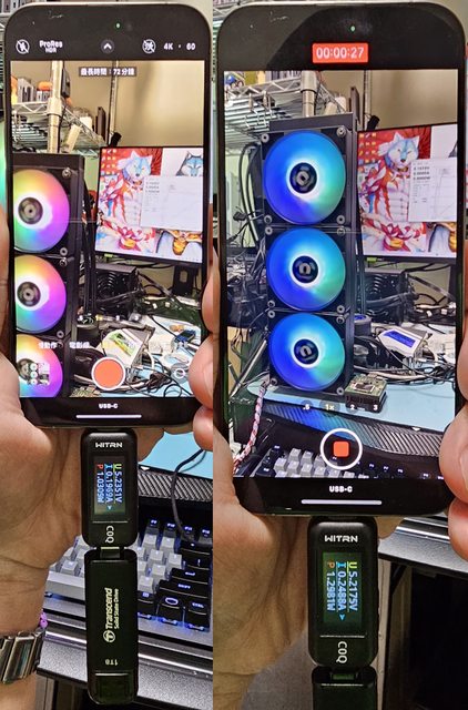 ▼改成ProRes HDR 4K/30fps格式,影片錄製10分鐘後Apple iPhone 15 Pro正面及背面的