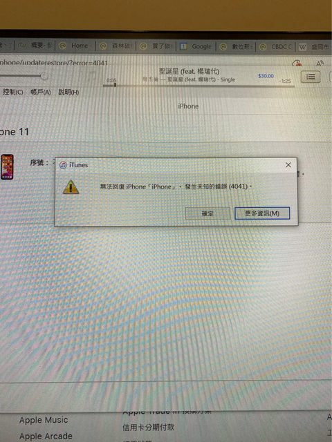 目前有接電腦,用itunes更新修復,但出現正在等待iphone,之後出現無法回復iphone,發生未知錯誤(4041)