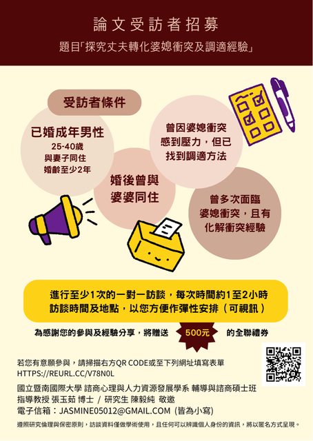 以及化解婆媳衝突的方式,希望符合下列條件的丈夫們,可以成為我的受訪者,符合條件