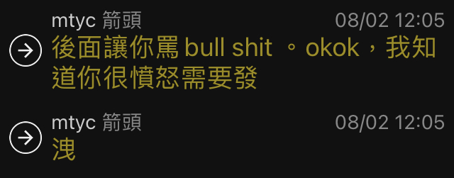 → mtyc : 後面讓你罵bull shit 。okok,我知道你很憤怒需要發 08/02 12:05