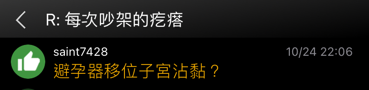 → bluevillage : po一直拿"因為你不避孕害我裝避孕器搞到沾黏"抱怨, 10/26 10:19