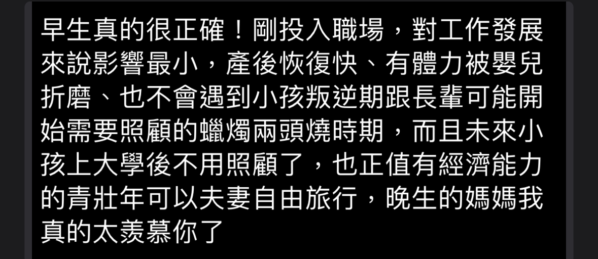推 makio : 這也是一種思考,要在25歲前儘量早生,這樣對職場發 10/28 17:12