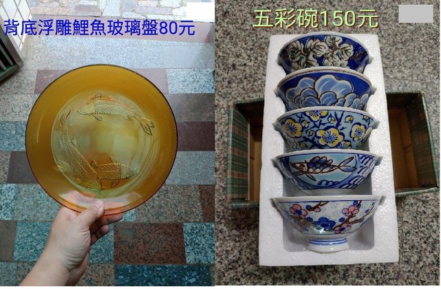 背底鯉魚浮雕黃玻璃盤80元/3個200元